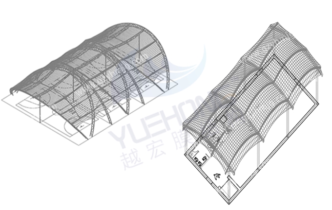 越宏膜結(jié)構(gòu)廠家的風(fēng)雨球場(chǎng)膜結(jié)構(gòu)是由鋼結(jié)構(gòu)和膜材組成,分別有張拉式膜結(jié)構(gòu)、索膜結(jié)構(gòu)、骨架式膜結(jié)構(gòu)、空間結(jié)構(gòu)式等供選擇,根據(jù)不同場(chǎng)景進(jìn)行設(shè)計(jì)出個(gè)性化膜結(jié)構(gòu)。